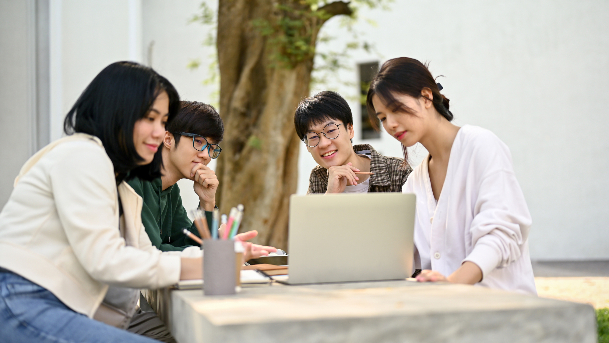Group of happy Asian college students looking at a laptop screen, discussing and working on their school project at a campus park together.